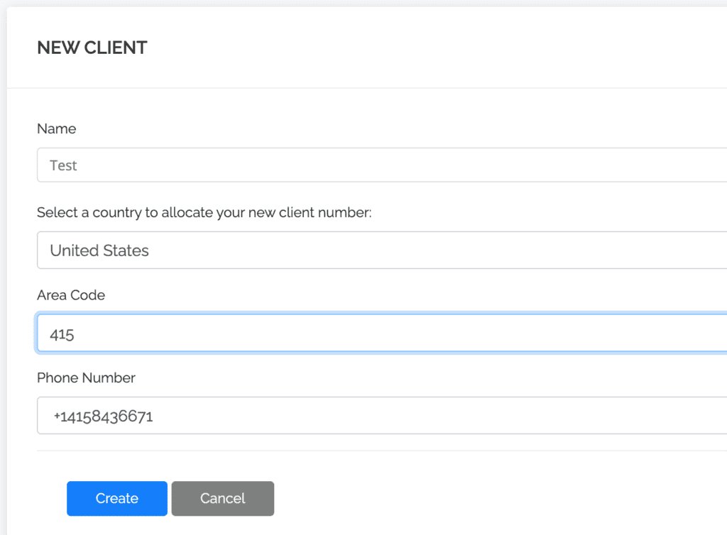3. Users will fill in the information displayed on the screen and select a new phone number for the client and click Create