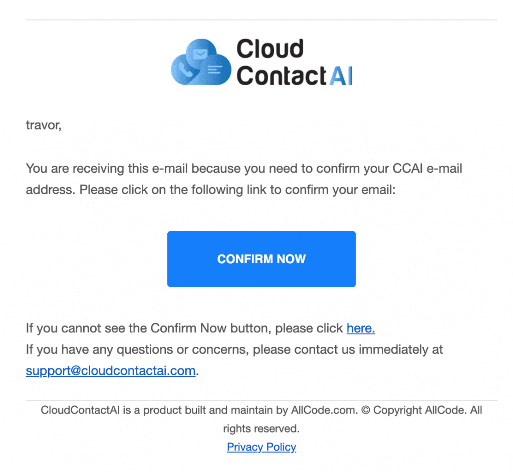 4. Next, you’ll receive an email asking you to verify your account. Click the Confirm Now button, which will direct you to CCAI to set and confirm a password