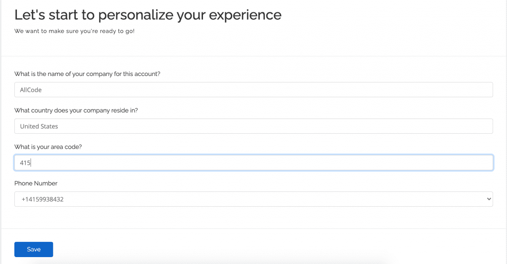 5. After you’ve set your password, you’ll be sent to the “Personalize your experience” page where you will be required to answer a few questions and configure a phone number. After you’ve filled this out, click Save