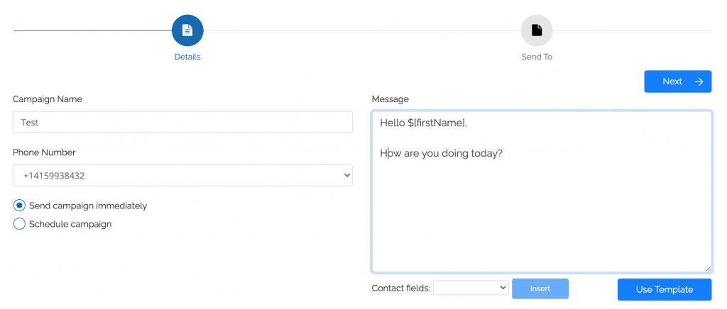 2. Name your campaign, select a time to send, choose the number you would like to send from, construct the message to your recipients, and click Next