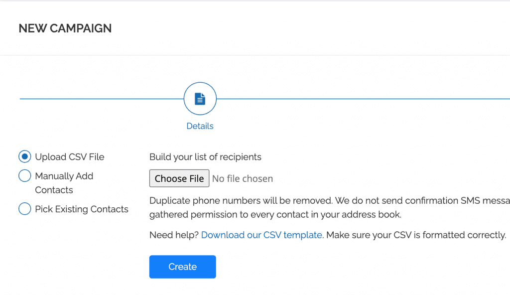 3. You will be directed to the contacts page where you can upload a new contact list, manually add contacts, or use existing contacts