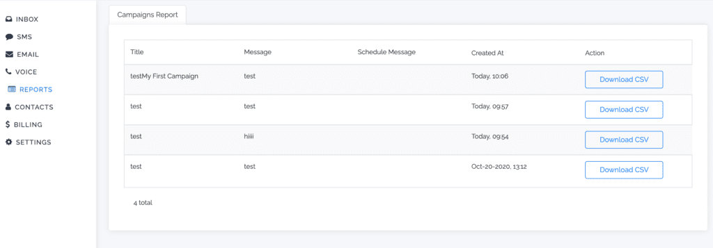 Navigate to the Reports tab in the menu. Here, you can click Download CSV to see to whom, when, and how the message was sent. It will also show incoming messages that were responses to the campaign.