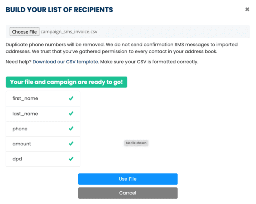 Specify your “campaign_sms_invoice.csv” file by clicking on the Choose File button.