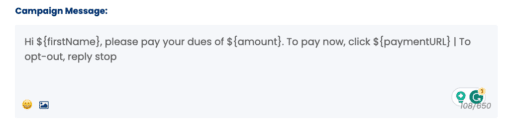 Back in the Create SMS Campaign screen, enter your message into the Campaign Message from above, “Hi ${firstName}, please pay your dues of ${amount}. To pay now, click ${paymentUrl} | To opt-out, reply stop”