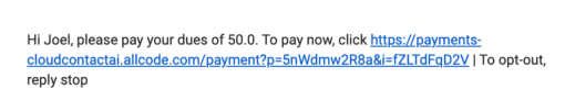 Your recipient will receive the following SMS Message which contains the payment gateway URL that CloudContactAI has created for this contact to collect.