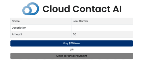 When you click on the link https://payments-cloudcontactai.allcode.com/payment?p=5nWdmw2R8a&i=fZLTdFqD2V. You’ll be taken to the Payment page.